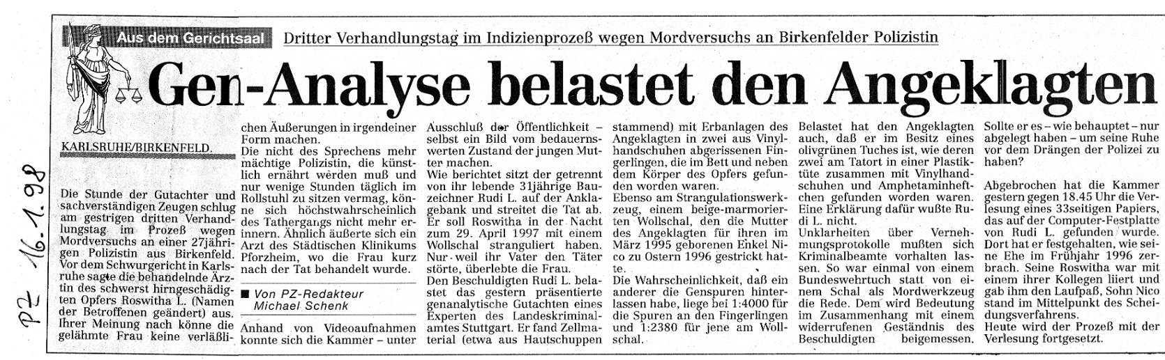 13.01.1998 Kleinkind der einzige Augenzeuge (Pforzheimer Zeitung) 16.01.1998 Gen-Analyse belastet den Angeklagten (Pforzheimer Zeitung) 20.01.2000 GROßVATER: SOHN BELASTET VATER Schadensersatzprozess für strangulierte Polizistin aus Birkenfeld mit ungewöhnlicher Wendung - Fortsetzung folgt von PZ-Redakteur Michael Schenk KARLSRUHE/BIRKENFELD. Ein knapp 5jähriger als Augenzeuge: Zwar muß Kai W. (4) wohl nicht vor dem Landgericht Karlsruhe gegen seinen Vater Harry aussagen. Doch indirekt erfuhr die 8. Zivilkammer gestern: Das Kind hat den 34jährigen belastet und die Tat geschildert. Zwei Jahre nachdem Harry W. aus Gräfenhausen in einem spektakulären Indizienprozess zu 11 Jahren, wegen versuchten Totschlags an seiner Ehefrau Andrea, verurteilt worden ist, saß er nun wieder im Schwurgerichtssaal auf der Anklagebank. Wegen des großen Besucherinteresses - etwa 40 hatten sich eingefunden - war die Kammer in den Schwurgerichtssaal ausgewichen. Dort hatte der Prozeß um 300.000 Mark Schmerzensgeld für das Opfer zunächst eine Zuspitzung erfahren. Denn Wolfgang Z., der Vater des Opfers, einer am Tattag 26jährigen Polizistin, sagte erstmals: Sein Enkel Kai habe bereits Ende September 1997 unvermittelt zu ihm gesagt: "Der Papa hat der Mama Aua gemacht". Diese Aussage habe Kai mehrfach wiederholt und dabei auch an den Hals gegriffen und später auch Details genannt. Kai, so schildert Wolfgang Z., habe derartige Aussagen ebenso im Kindergarten gemacht, was zwei Erzieherinnen bestätigten. Im Strafprozeß 1998 habe er, so Wolfgang Z., diesen Umstand nicht erwähnt, weil er davon ausgegangen sei, man werde dem ohnehin keinen Glauben schenken. Die kurz vor der Scheidung stehende und getrennt von Ehemann Harry W. lebende Andrea Z. war am 29.4.97 gegen 2.30 Uhr im Wohnhaus in der Erlenstrasse in Birkenfeld überfallen und mit einem Schal fast zu Tode stranguliert worden. Nach der Reanimation durch den Vater, der in der Einliegerwohnung im Souterrain genächtigt hatte, ist die Frau heute schwerstgeschädigt, ein Pflegefall; sie kann sich nicht mehr artikulieren und den Täter nennen. Das Kind hatte das Verbrechen im Schlafzimmer der Mutter vom Bett aus verfolgt. Es konnte aber damals lediglich Wörter wie Mama und Papa, aber noch keine Sätze sprechen. Ergo: Opfer wie Augenzeuge konnten den Täter nicht benennen. Insgesamt 5 quälende Stunden zog sich gestern die Einvernahme von Wolfgang Z. hin. Der Anwalt von Harry W., Hubert Gorka; nutzte sein Fragerecht weidlich aus. Hintergrund: Gorka hatte Wolfgang Z. wegen angeblicher Falschaussage im Strafprozess im vergangenen Oktober angezeigt. Hätte der Advokat damit Erfolg, könnte dies als Hebel dienen, eine Wiederaufnahme des Strafverfahrens zu erreichen. Denn das Oberlandesgericht hatte die Revision verworfen. Für Wolfgang Z., mittlerweile Polizist außer Dienst, eine quälende Prozedur, noch einmal minutiös die Details der schrecklichen Nacht zu schildern. Wie er durch Klopfgeräusche erwachte, wie er die Tür aufdrückt und die entblößten Beine seiner Tochter am Boden sah; wie er die Tür vom überraschten Täter entgegengeschlagen bekam, wie er schließlich nach unten rannte um Hilfe herbei zu telefonieren und sein schnurloses Telefon unten nicht fand; wie er dann seine Tochter leblos am Boden fand, wie sein Enkel ihn mit großen Augen anblickte; wie er verzweifelt den festgeknoteten Schal von ihrem Hals entfernte und, und, und... "Dieses Bild sehe ich jede Nacht vor mir", schluchzte er. Gorka's Unterfangen,Wolfgang Z. eine relevante Falschaussage nachzuweisen, schien gestern jedenfalls nicht von Erfolg gekrönt. Im Verlauf der achtstündigen Verhandlung, die fortgesetzt wird, standen zudem widersprüchliche Aussagen im Raum. Eine Polizeibeamtin habe in einem Kneipengespräch gegenüber einem Bekannten behauptet, ein Kollege von ihr sei der Täter. Gestern stand ihr Wort gegen das des Bekannten. Fazit des Vorsitzenden Richters Wolf-Rüdiger Waetke: "Einer hat die Unwahrheit gesagt." Auf eine Vereidigung der beiden verzichtete die Kammer jedoch.